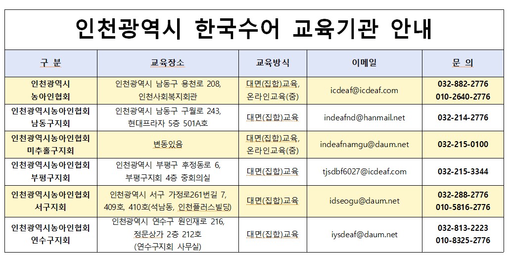 인천광역시 농아인협회: 032-882-2776, 010-2640-2776
