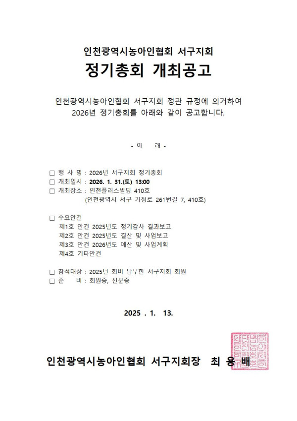 인천광역시농아인협회 서구지회 정관 규정에 의거하여 2026년 정기총회를 아래와 같이 공고합니다.
