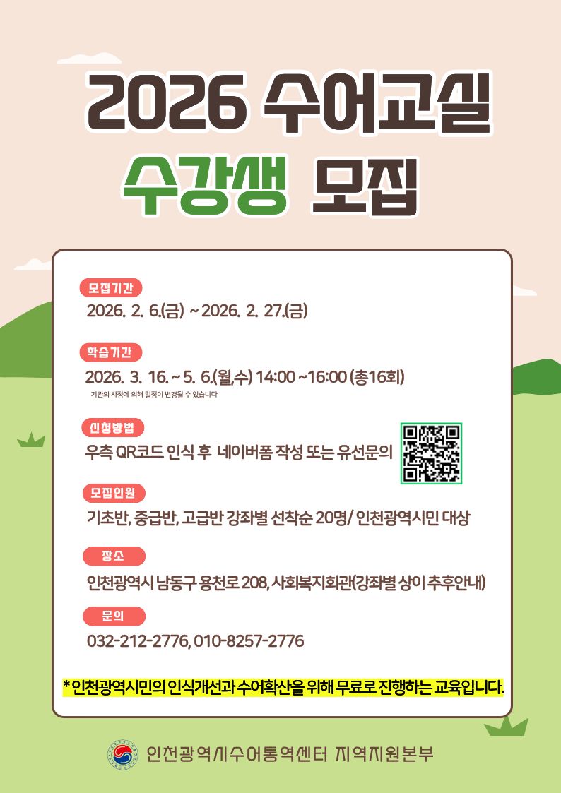 2026년 상반기 수어교실 개강을 안내드립니다.