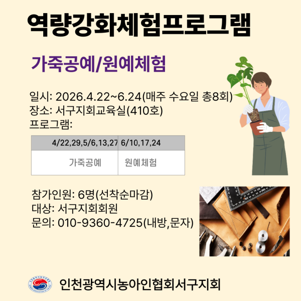 프로그램 일정 일 자 | 내용 | 비고 | 2026.4.22.(수) | 파우치 백, 클러치 백 중 택1 | | 2026.4.29.(수) | 선글라스 케이스, 가죽 필통 중 택1 | | 2026.5.6.(수) | 핸드폰 케이스, 반지갑 중 택1 | | 2026.5.13.(수) | 통가죽 핸드백 만들기 1차시(염색) | | 2026.5.27.(수) | 통가죽 핸드백 만들기 2차시(조립,장식달기) | | 2026.6.10.(수) | 이끼 테라리움 만들기 | | 2026.6.17.(수) | 세라믹아트 다육 화분 만들기 | | 2026.6.24.(수) | 생화 리스 만들기 | |