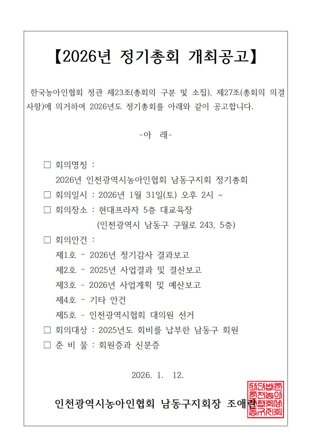 【2026년 인천광역시농아인협회 남동구지회 정기총회 개최공고】
